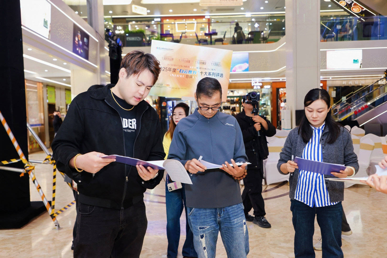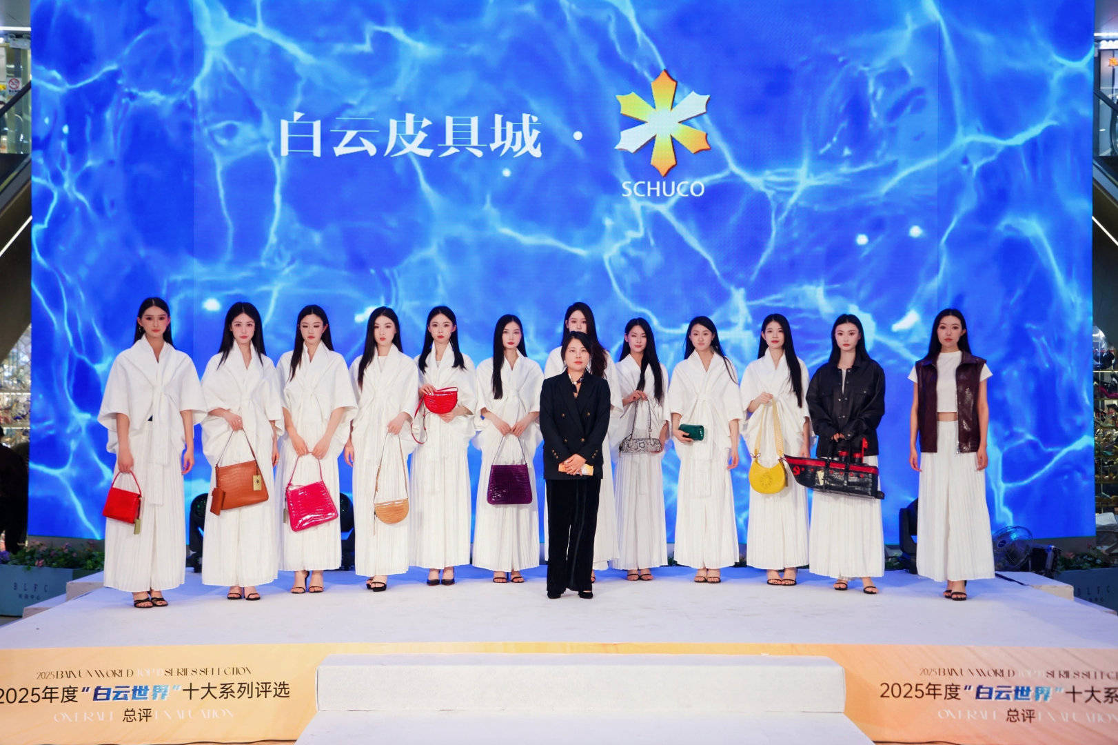 下午活动重心移至一期大堂,一场融合视觉艺术与商业魅力的品牌走秀评比隆重上演。在动感的开场舞之后,活动现场首先通过一段初评回顾视频,引领全场嘉宾共同重温了评选历程中的精彩瞬间,感受“白云世界”涌动的时尚脉搏。