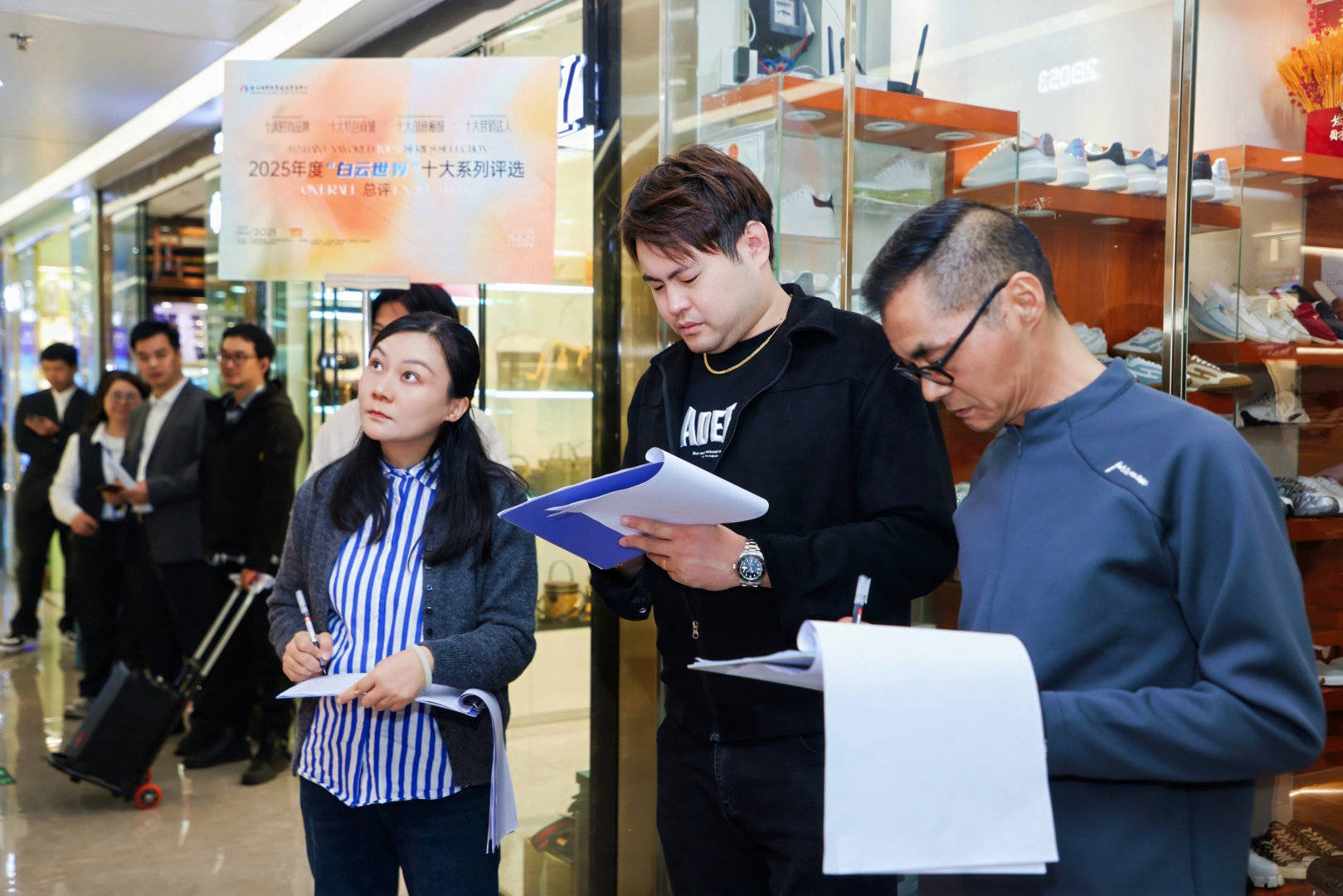 当天上午,总评活动正式启动。白云皮具城各部门领导及业内权威专家评审团召开了考评预备会议,为评选工作的严谨性打下坚实基础。由业内权威专家组成的时尚行业大咖评审团率先开展实地考察评分工作。评委们对晋级的品牌、商铺及创意橱窗及营销达人进行了细致入微的现场评分。